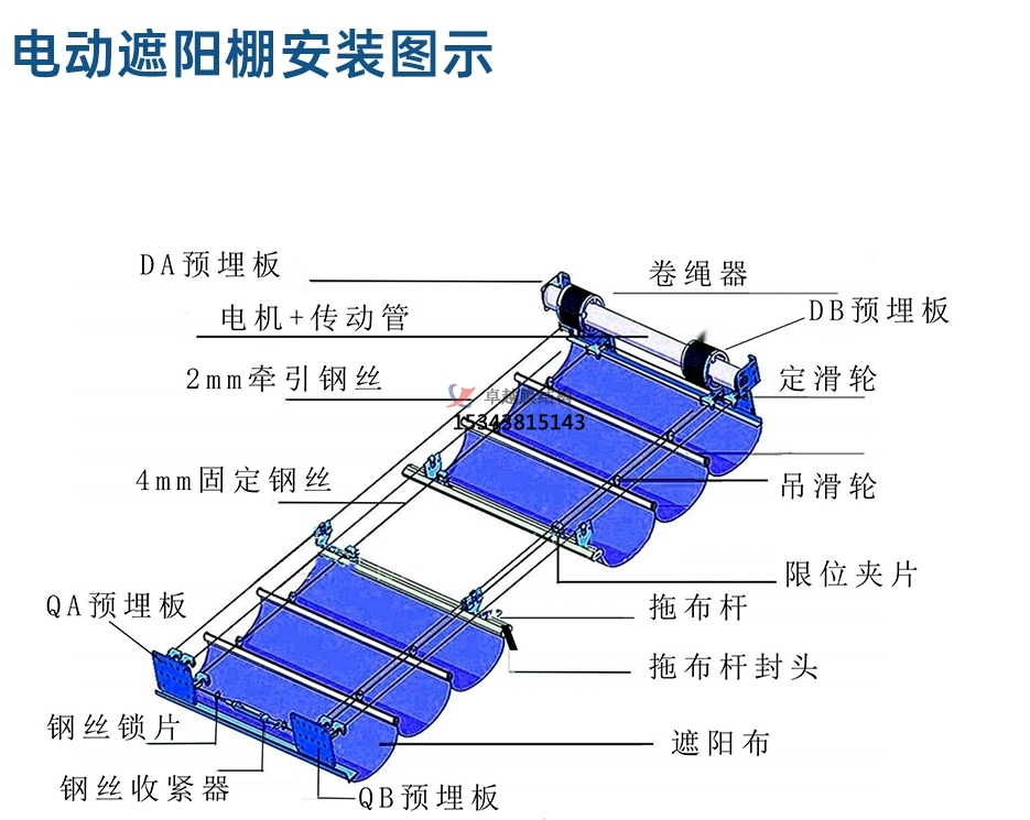 幼兒園FCS折疊遮陽天棚即使用管狀電機,利用鋼絲循環(huán)運動,從而帶動面料收放,達(dá)到遮陽的效果。FCS折疊遮陽天棚機構(gòu)分為傳動和面料兩大部分:上方傳動部分的另一端為動力端,利用管狀電機旋轉(zhuǎn)帶動卷管及固定在卷管上的卷繩器旋轉(zhuǎn)從而是一根鋼絲繩進行收放。傳動部分的另一端為滑輪鋼絲通過滑輪進行換向,使一根鋼絲的兩端能同時固定卷繩器上,并且鋼絲始終保持繃緊。面料部分的上半部分是一根兩端固定并繃緊的鋼絲(天棚簾跨度過大的改用滑動門軌),下半部分為面料,面料從頂端開始安裝牽引桿,間距等分(通常為0.8米左右)。牽引桿上安裝流動滑輪,滑輪在固定在鋼絲上運行。第一根牽引桿與傳動鋼絲連接,在電機固定鋼絲展開與收攏。