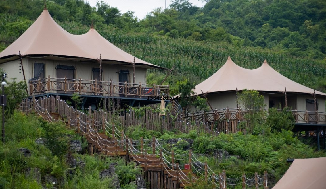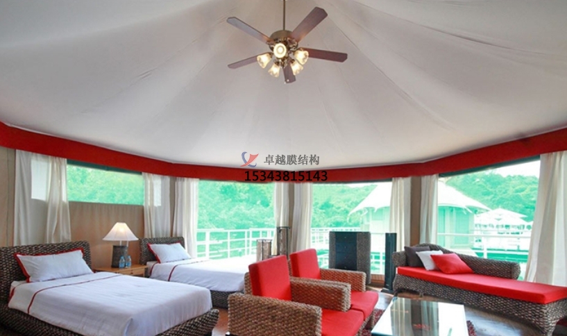 膜結構帳篷酒店膜材是一種無毒的高分子材料。它具有無味的特點,安裝后沒有一絲味道。另外,它擁有抗紫外線和反射光線極強的特點,而且其抗撕裂的性能強,還有B1/M2級別的阻燃性能,并且使用壽命極強,一般壽命都在20年以上。