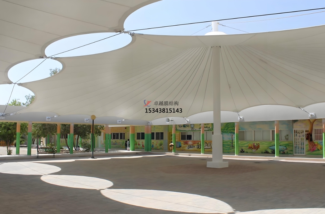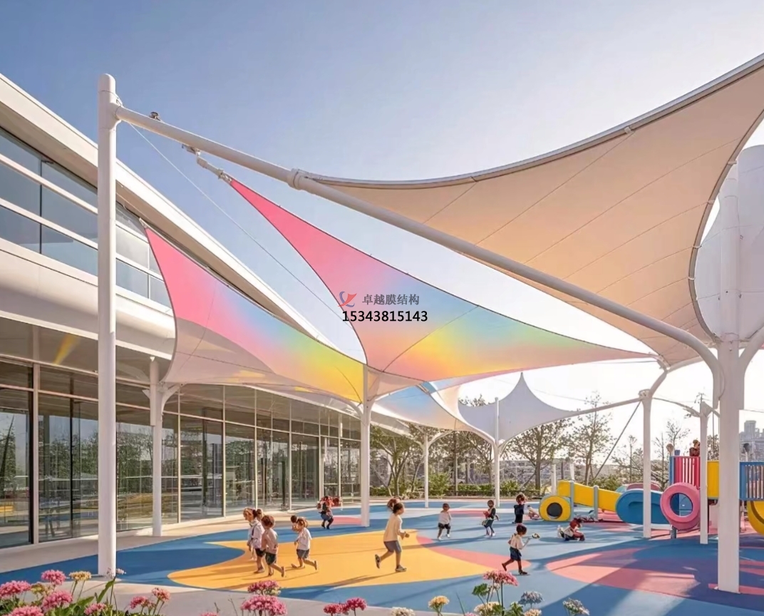 膜材料具有良好的透光性,可以在保證遮陽(yáng)的同時(shí),讓自然光線柔和地灑入室內(nèi),為孩子們提供充足的日照,有利于他們的視力保護(hù)和身心健康。同時(shí),膜結(jié)構(gòu)的設(shè)計(jì)通常結(jié)合高效的通風(fēng)系統(tǒng),確保室內(nèi)空氣流通,即使在炎熱的夏季也能保持室內(nèi)涼爽,為孩子們創(chuàng)造一個(gè)舒適的學(xué)習(xí)環(huán)境。