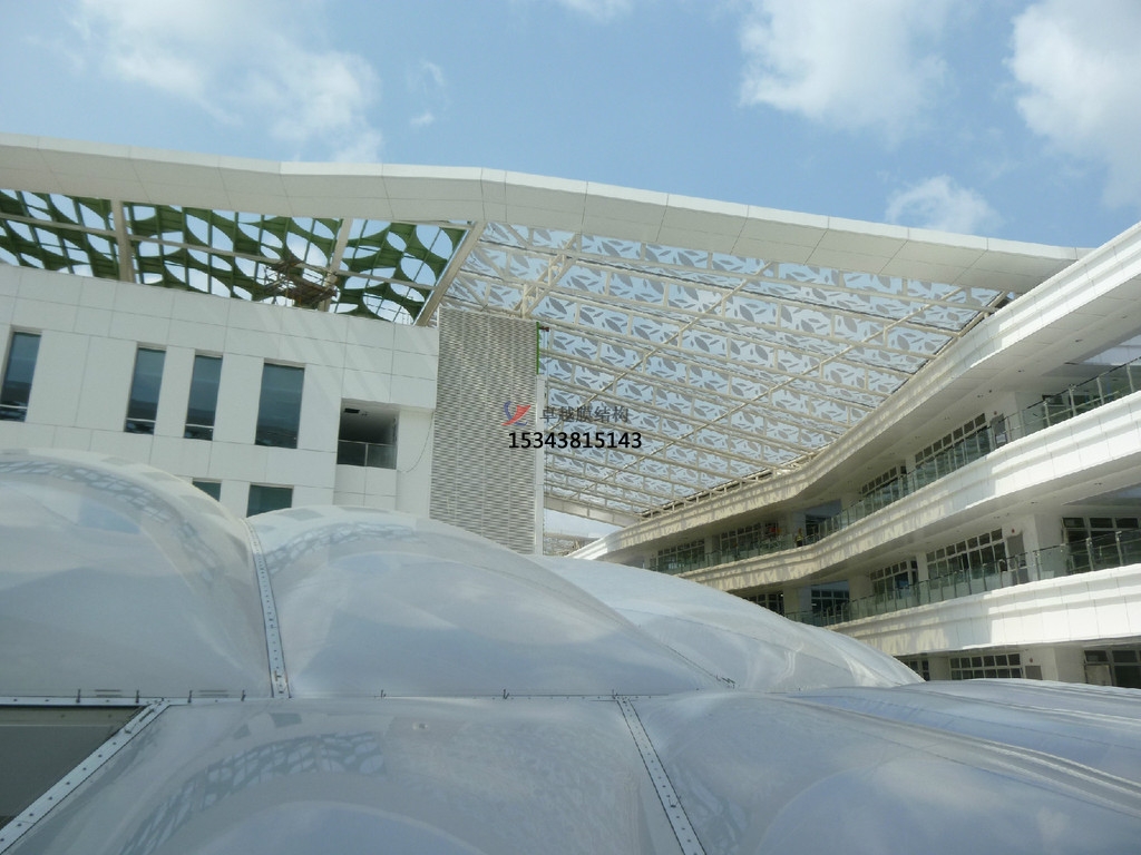 ETFE膜結(jié)構透光性怎么樣?ETFE膜材自身由于直接熱塑成形,厚度很薄,原本就具有很高的透光率。通過對膜材表面鍍銀色圓點可以調(diào)節(jié)膜材的透光率,從而滿足室內(nèi)不同的采光需求。
