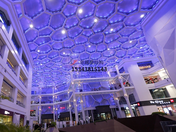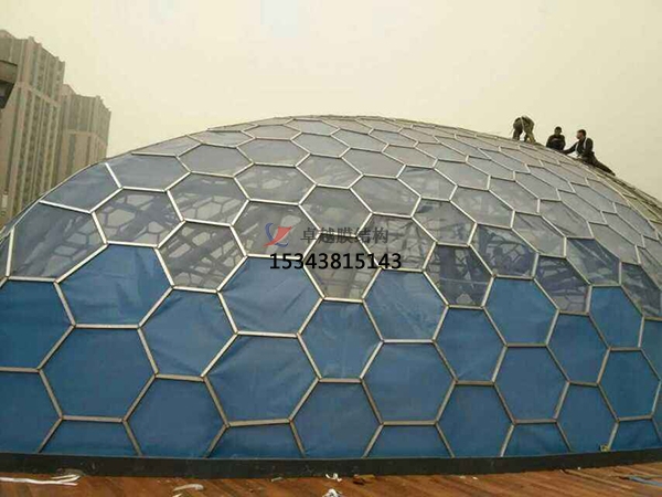 ?。?)顏色和透光性:ETFE膜材通常為無色透明狀,也可以做成白色、藍(lán)色或者其他顏色。根據(jù)需要也可以在無色透明或者其他顏色膜材上印制各種圖案。