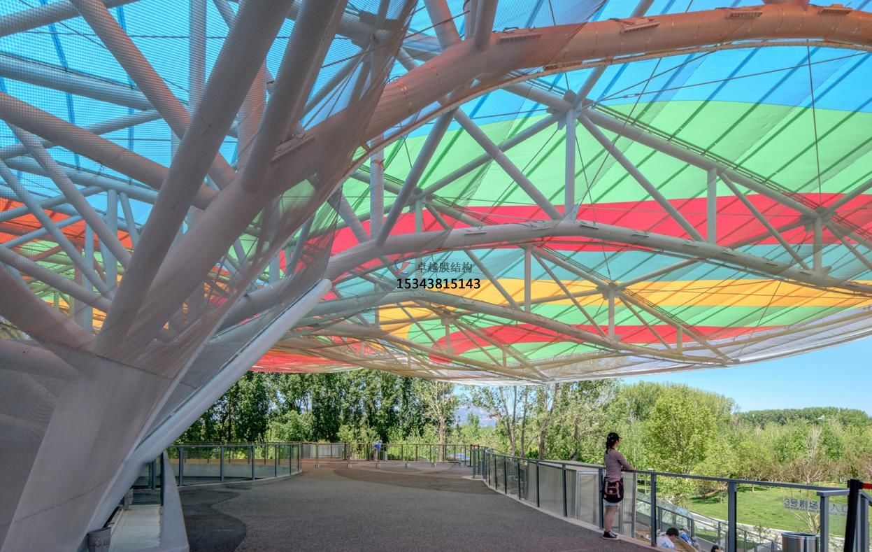 同時,ETFE膜結構的延展性大于400%,確保膜結構可以經(jīng)過張拉力形成各種三維空間曲面造型。