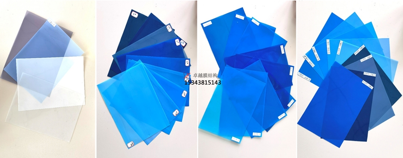 2022年,大連梭魚灣體育中心,立面使用德國(guó)NOWOFOL ETFE 9種不同藍(lán)色彩膜,頂面內(nèi)圈使用透明