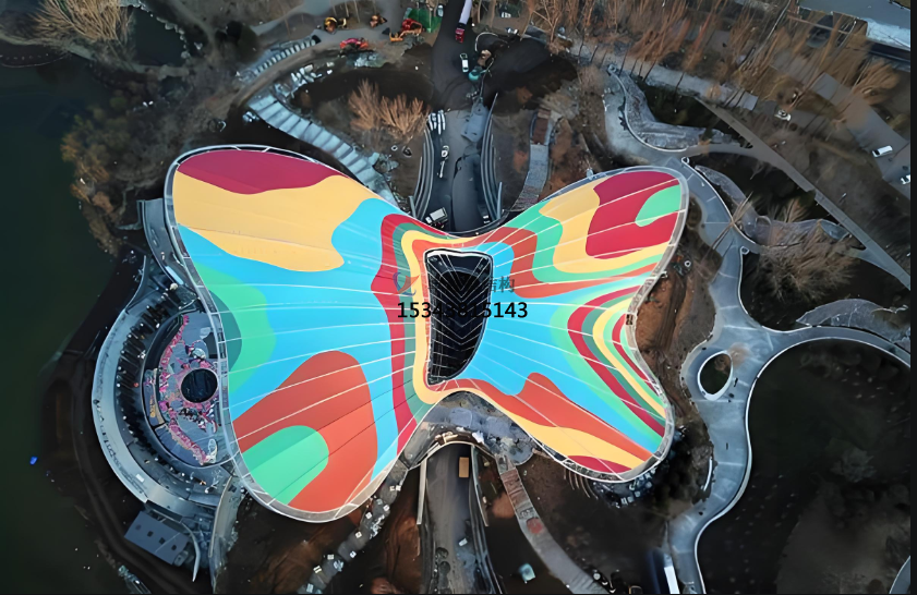 ETFE膜材除了常規(guī)的透明、藍(lán)色、白色、銀色鍍點外,其實還有五顏六色的彩色系列。今天就給大家介紹一個ETFE彩色膜應(yīng)用的經(jīng)典案例2019年北京世園會的主場館——媯汭劇場,外觀為彩色蝴蝶造型。
