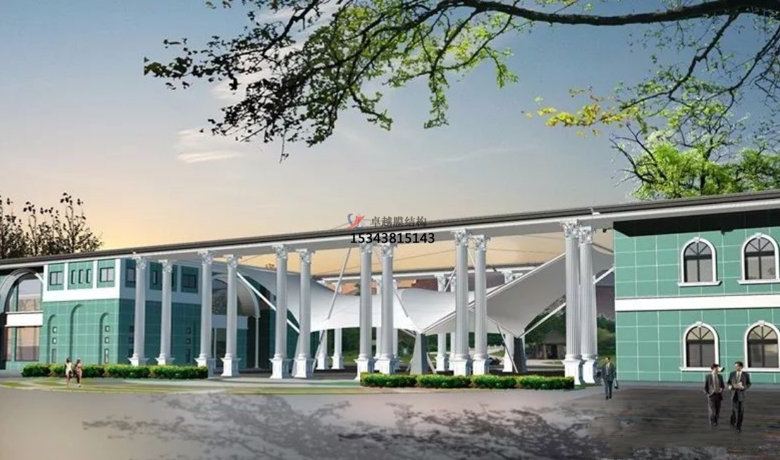 膜結(jié)構(gòu)形式的大門設計越來越多,膜材材質(zhì)輕,安全性高,透光率好,塑造的門頭外形優(yōu)美、造型獨特,充滿著時尚韻味,大氣而不失穩(wěn)重。