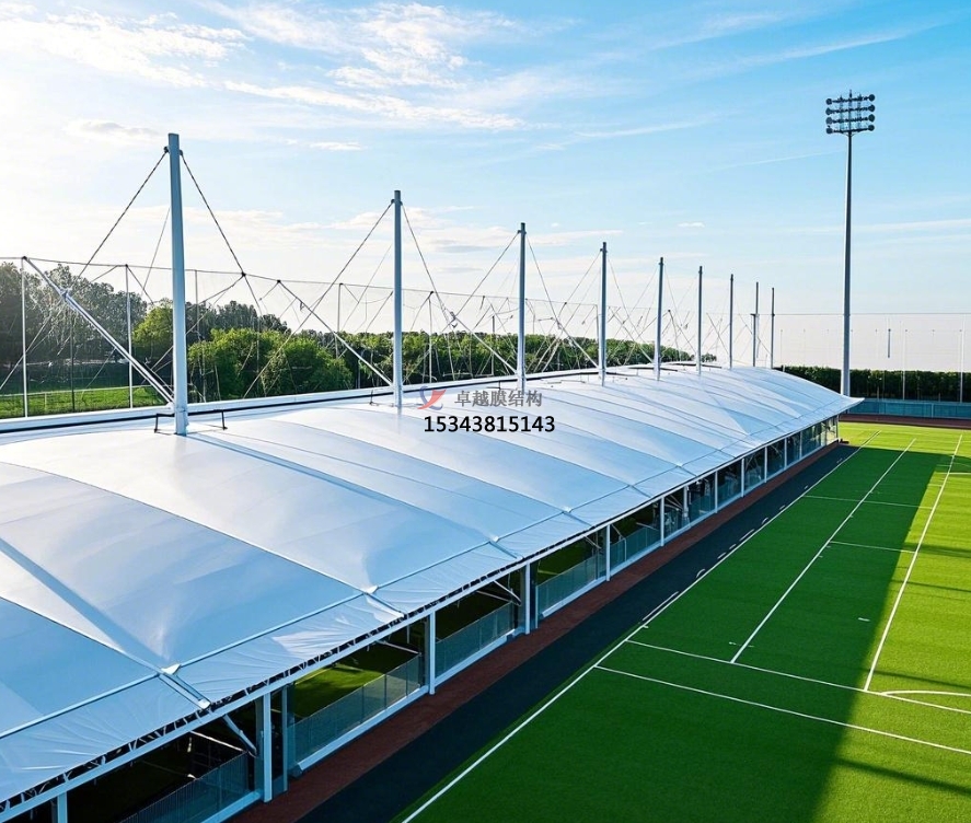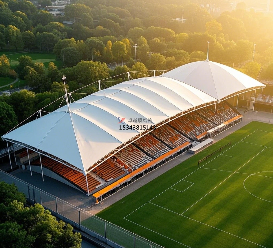 足球場膜結(jié)構(gòu)主要由膜材與支撐結(jié)構(gòu)攜手構(gòu)建。膜材堪稱核心角色,常用的如聚四氟乙烯(PTFE)膜材,不僅具備超強(qiáng)的耐候性,可從容應(yīng)對風(fēng)吹日曬、雨雪侵襲,長期使用也不易老化損壞;其自潔性能更是出色,表面不易沾染灰塵污垢,能始終保持潔凈外觀。乙烯 - 四氟乙烯共聚物(ETFE)膜材同樣表現(xiàn)不凡,擁有良好的透光性,可讓充足的自然光灑入足球場,營造明亮舒適的運(yùn)動(dòng)環(huán)境,同時(shí)具備較高的強(qiáng)度與柔韌性 。