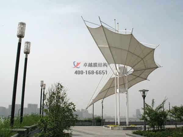 6、景觀膜結構不僅能夠根據(jù)園林景觀的實際情況設計出能夠跟自然景觀和諧一體的造型,重要的是還能提供豐富多彩的用途,讓人賞心悅目,景觀膜結構充分展示了結構構件清晰受力的藝術之美,配合周圍景色創(chuàng)造出一種現(xiàn)代與自然結合的感覺;