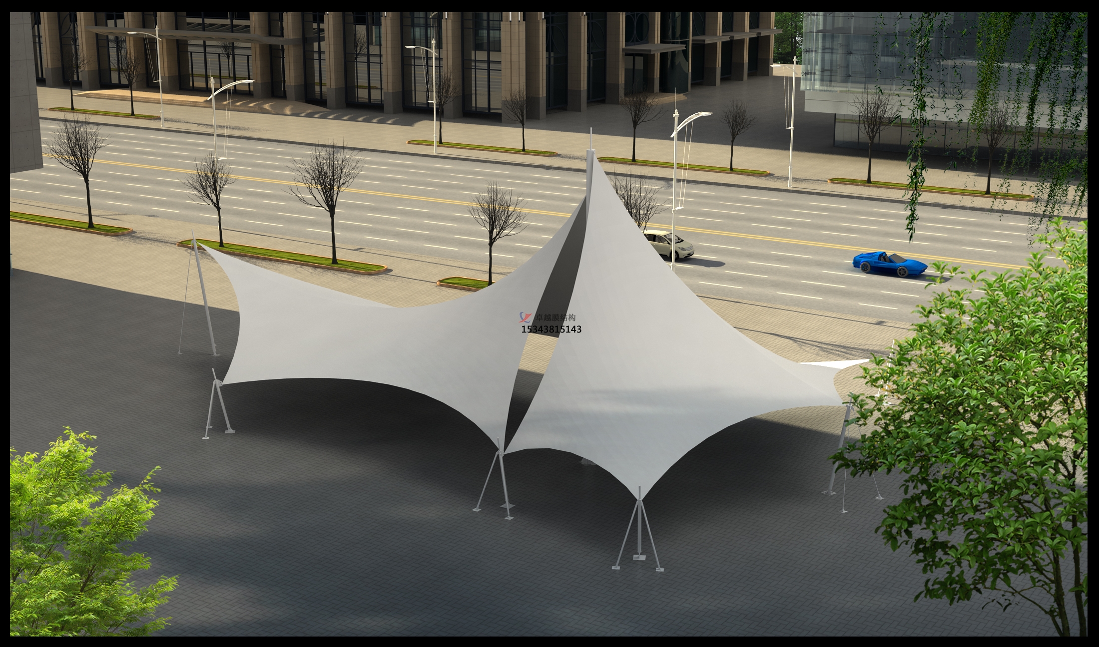 工程結(jié)構(gòu)形式:骨架式膜結(jié)構(gòu)景觀,自然排水。