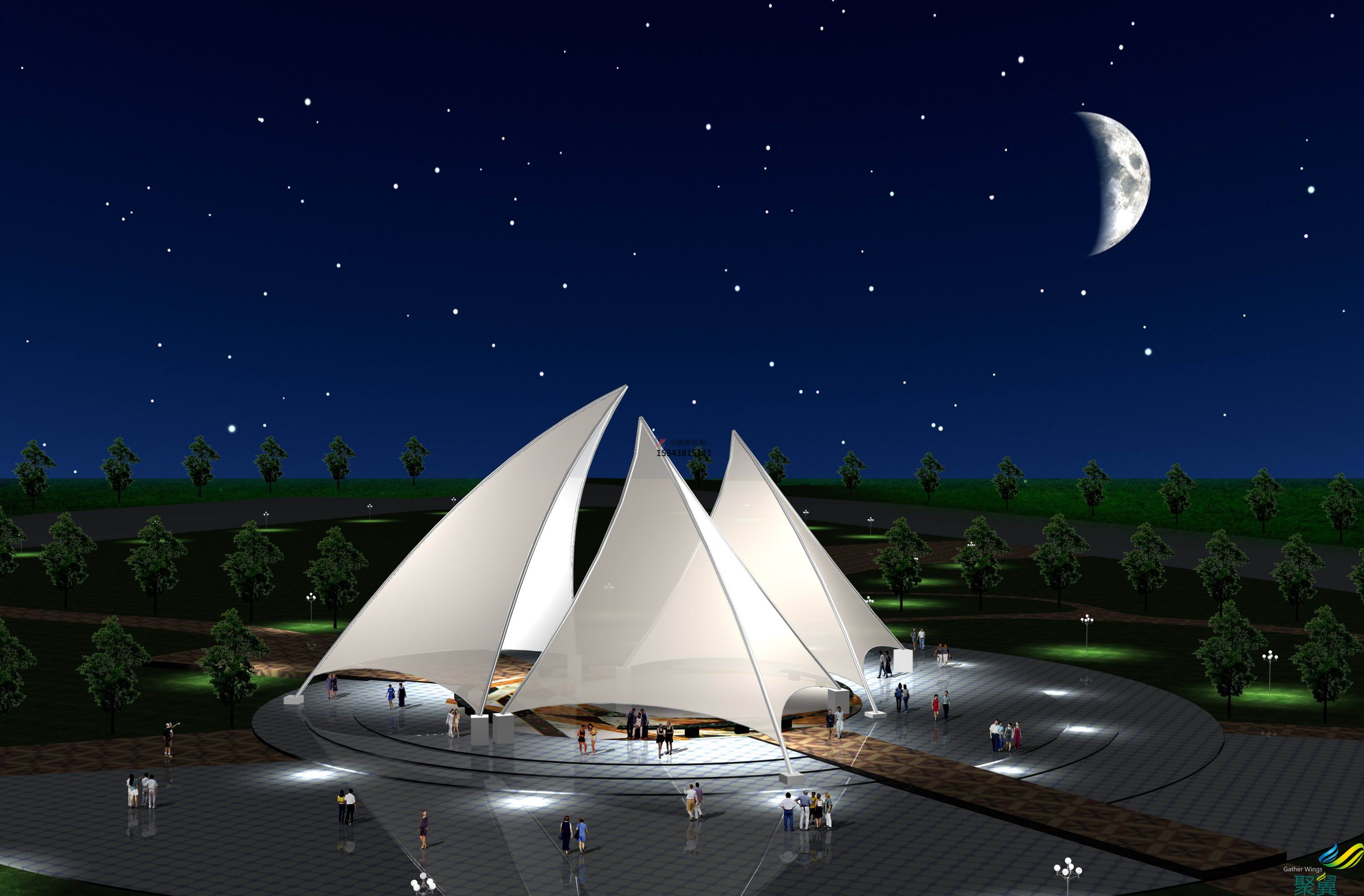 項(xiàng)目結(jié)構(gòu)形式:四周軟邊骨架式張拉膜結(jié)構(gòu)景觀小品