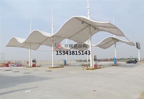 膜結(jié)構(gòu)建筑因其獨(dú)特的藝術(shù)性,優(yōu)美的造型,濃郁的現(xiàn)代氣息,被廣泛運(yùn)用到建筑領(lǐng)域的各種設(shè)施。加油站膜結(jié)構(gòu)運(yùn)用在加油站頂蓬上是再合理不過(guò)的選擇,因?yàn)榧佑驼镜捻斉袷枪坊虻貐^(qū)設(shè)置名稱標(biāo)牌的主要位置,是公路或地區(qū)的重要標(biāo)志;大跨度的膜結(jié)構(gòu)在這種場(chǎng)合下的運(yùn)用,能充分體現(xiàn)膜結(jié)構(gòu)的主要特點(diǎn),并有較好的標(biāo)識(shí)招攬效果。為相關(guān)的道路或區(qū)域起到畫龍點(diǎn)睛的作用。卓越張拉膜雨棚工程是較早年開展張拉膜設(shè)計(jì)施工的專業(yè)廠家,擁有各類張拉膜設(shè)計(jì)施工總承包資質(zhì),現(xiàn)在為大家介紹一下我司在大同周邊地區(qū)完工的一批張拉膜雨棚工程案例,我司先后在大同附近地區(qū)完工了金龍二站加油站張拉膜雨棚頂蓋、大同金龍龍泉站張拉膜雨棚遮陽(yáng)篷、大同金龍加油站金龍三站張拉膜雨棚罩棚等一批完工項(xiàng)目,給大家簡(jiǎn)介一下: