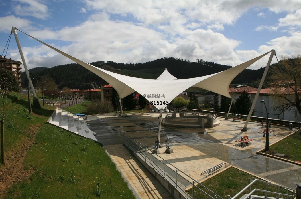 遮陽與擋雨:在戶外公共空間中,景觀膜結構常被用作遮陽篷、雨篷或涼亭,為游客提供舒適的休憩環(huán)境。其大跨度的設計能夠覆蓋較大的區(qū)域,滿足不同天氣條件下的使用需求。