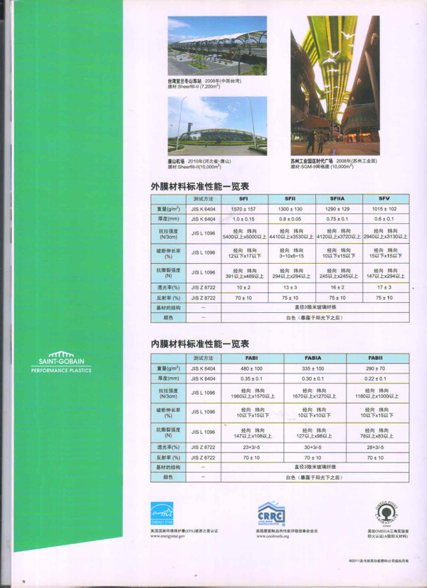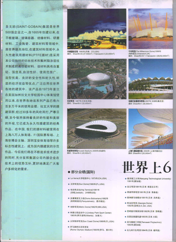 圣戈班工業(yè)薄膜為市場提供高性能聚合物薄膜、微孔過濾膜、薄膜圖層、復合薄膜和壓敏膠帶等多種產品近40多年,在相關行業(yè)中具有領先的地位。在諸多建筑中,我們都能看到圣戈班的影子,其中就有被很好的建筑師青睞的PTFE的建筑膜,實際上它就是圣戈班SHEERFILL®建筑網(wǎng)格布。