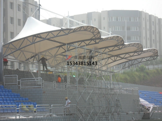 為了抵擋風雪,膜面的外形應使排水通暢使捷,避免在其上形成水兜或雪的堆積。在施加預應力前的安裝成形階段,張拉膜結構對這些荷載十分敏感。為了能將雨水排除,膜材和接縫須密封防水,膜邊緣也進行特殊的細部設計,以防止雨水進入室內(nèi)。