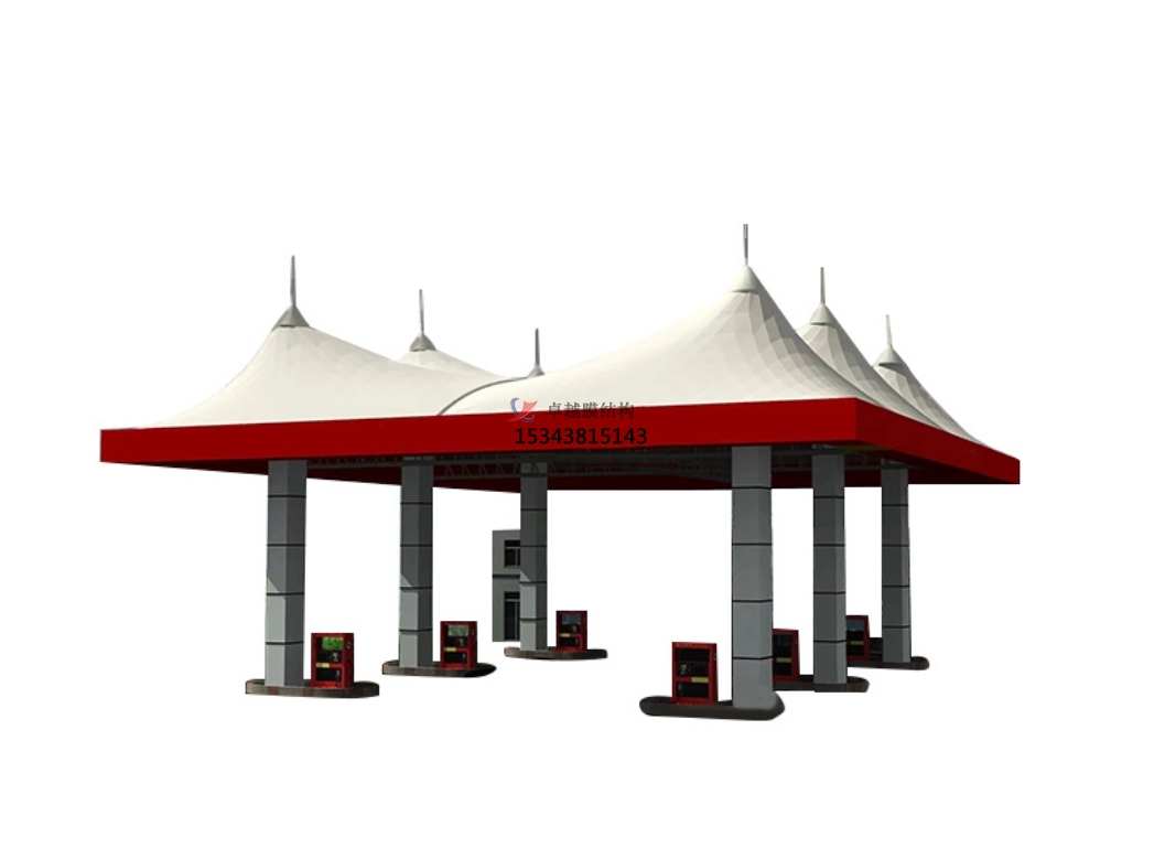 3. 靈活的造型設計:加油站膜結構頂棚可根據建筑需求進行個性化設計,采用曲面造型,不僅美觀大方,還能有效分散雨水和風力,增強頂棚的穩(wěn)定性。