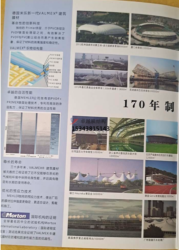 德國MEHLERHAKU米樂公司擁有165年(1837年一2003年)的制造業(yè)經(jīng)驗(yàn)。通過1S09001質(zhì)量體系認(rèn)證,所有產(chǎn)品均經(jīng)過嚴(yán)格的DIN德國工業(yè)標(biāo)準(zhǔn),以及各個(gè)國家的膜材工業(yè)標(biāo)準(zhǔn)。2002年,德國米樂公司獲聘為中華人民共和國建設(shè)部《索膜建筑結(jié)構(gòu)制品》行業(yè)標(biāo)準(zhǔn)編制委員成員。德國米樂的產(chǎn)品系列涵蓋環(huán)保等各種PVC膜材領(lǐng)域,包括:建筑工程、輕型結(jié)構(gòu)、廣告、遮陽、汽艇、軍用、裝飾、水利環(huán)保,等等。