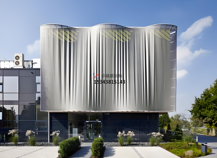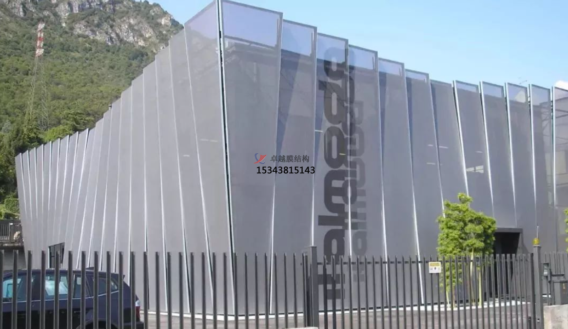 膜結(jié)構(gòu)幕墻是膜結(jié)構(gòu)在建筑外圍護(hù)結(jié)構(gòu)的應(yīng)用,以耐候性的柔性織物作為圍護(hù)材料,結(jié)合框架系統(tǒng),對既有建筑的外立面進(jìn)行翻新改造或新建筑外立面設(shè)計(jì)應(yīng)用的一種建筑外立面解決方案。膜結(jié)構(gòu)充滿張力且富于變化的曲面,自在靈敏的大空間、透明半透明膜材所構(gòu)成的明亮而又溫和的室內(nèi)環(huán)境,桅桿、拉索、精致的金屬節(jié)點(diǎn)等所表現(xiàn)的富有現(xiàn)代氣息的結(jié)構(gòu)技術(shù),給人們提供了有別于傳統(tǒng)幕墻結(jié)構(gòu)的全新視覺感受,它具有環(huán)保節(jié)能、可100%回收再利用、施工方便、重量輕、高強(qiáng)、高彈、高透光性、柔軟流暢、造型美觀、結(jié)構(gòu)固定簡單等特點(diǎn)。