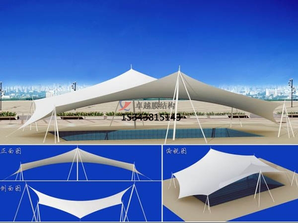膜結(jié)構(gòu)的結(jié)構(gòu)形式:是由多種高強(qiáng)薄膜材料(PVC或Teflon)及加強(qiáng)構(gòu)件(鋼架、鋼柱或鋼索)通過(guò)一定方式使其內(nèi)部產(chǎn)生一定的預(yù)張應(yīng)力以形成某種空間形狀,作為覆蓋結(jié)構(gòu),并能承受一定的外荷載作用的一種空間結(jié)構(gòu)形式。