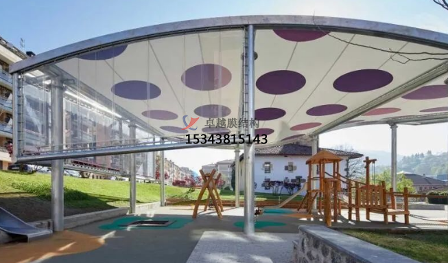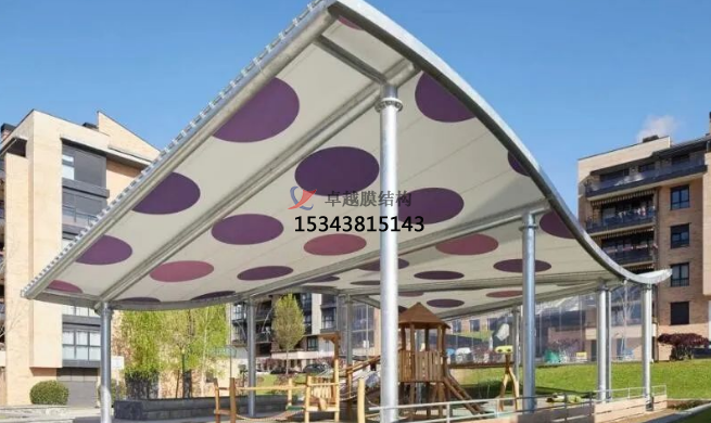 兒童游樂場所本就是趣致可愛的,迎合孩子們的喜好,配套遮陽設(shè)施的建設(shè)也應(yīng)該考慮在內(nèi),下面兩個遮陽項(xiàng)目屬于同一系列,波點(diǎn)圖案,活潑的色調(diào),再加上起伏的造型,讓人感覺輕松愉快。兩個項(xiàng)目都采用PVC+ETFE膜材。
