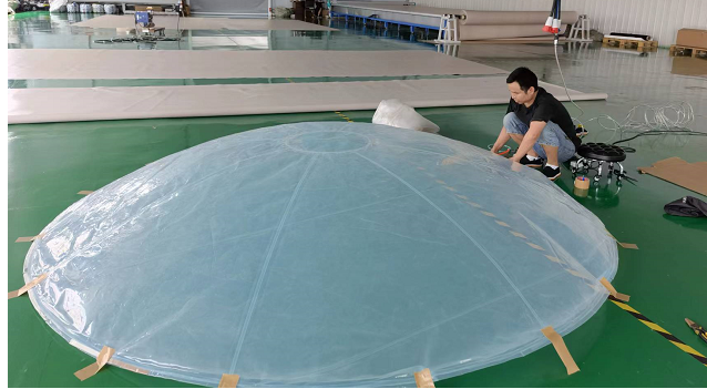 因此在設(shè)計中進行找形剖析、荷載剖析時是一個要點考慮的問題。其次在裁剪膜片時,一般應使膜片纖維方向與主應力方向共同,一起考慮膜材沿經(jīng)向、緯向的縮短量。再者膜面裝置前要對相關(guān)土建尺度誤差進行校核,及時調(diào)整膜片尺度,防止呈現(xiàn)PTFE膜材褶皺問題。