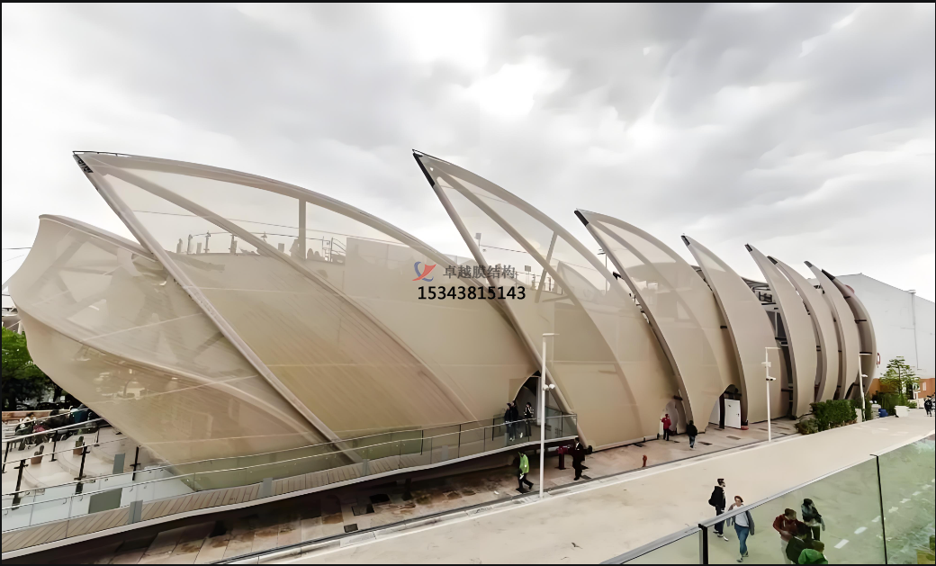 :公園中的休息亭、花架、遮陽廊等景觀小品,使用 PTFE 網(wǎng)格覆膜進(jìn)行覆蓋,可與周圍的自然景觀相融合,形成獨(dú)特的景觀效果,為游客提供舒適的休息和觀賞空間。