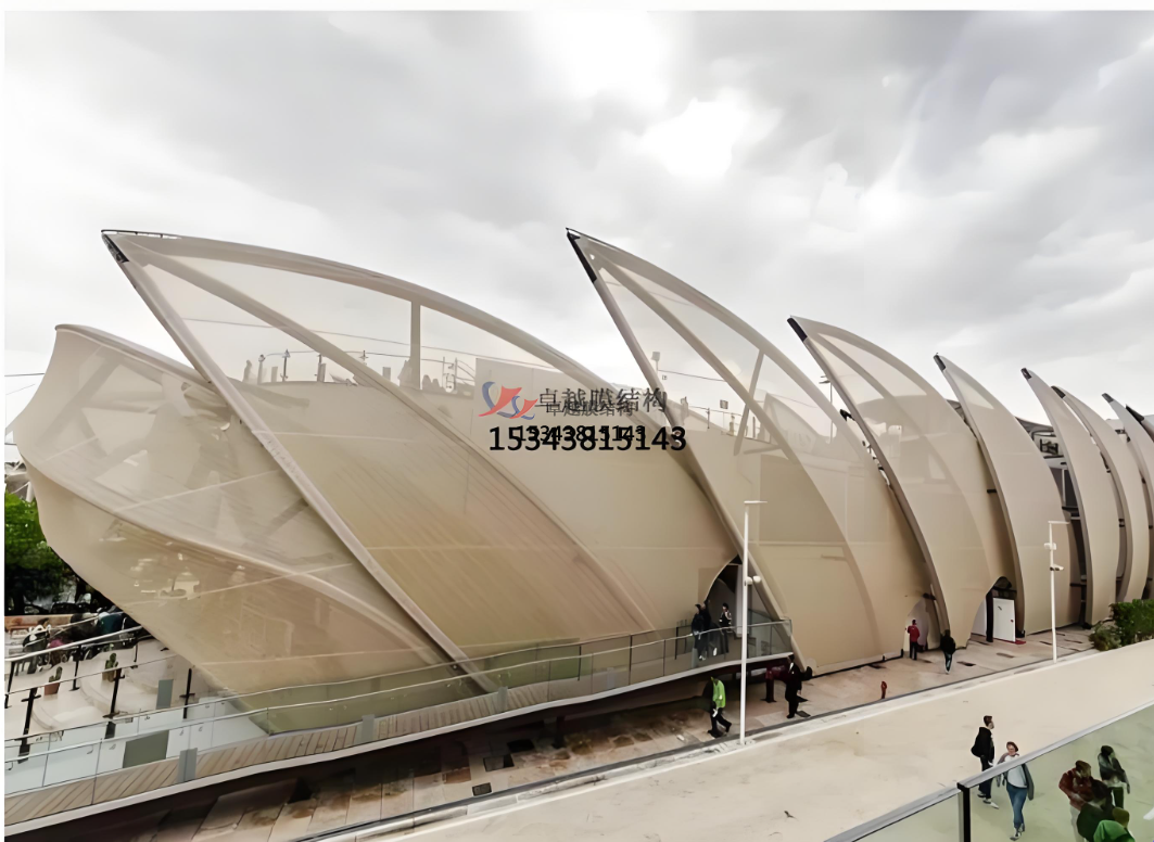 可塑性:膜材柔軟,可塑性強,可以被拉伸成為各種動態(tài)感強的形狀,配合膜結(jié)構(gòu)可以實現(xiàn)各種突破傳統(tǒng)模式的造型,創(chuàng)造大面積無柱覆蓋的空間。