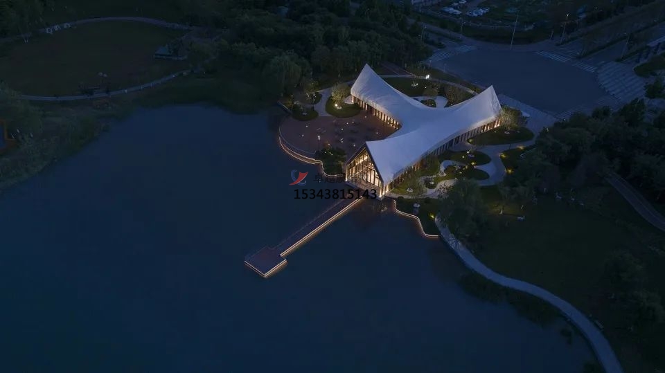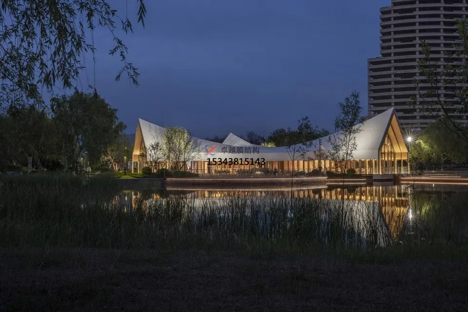 設計采用了新型鋼木組合結構,工廠預制,建造便捷,縮短工期。屋頂使用的是白色PVDF膜材,通過張拉性能實現(xiàn)三維屋面造型,勾勒出流暢的屋脊線,強化建筑簡潔、干凈的形體美感。