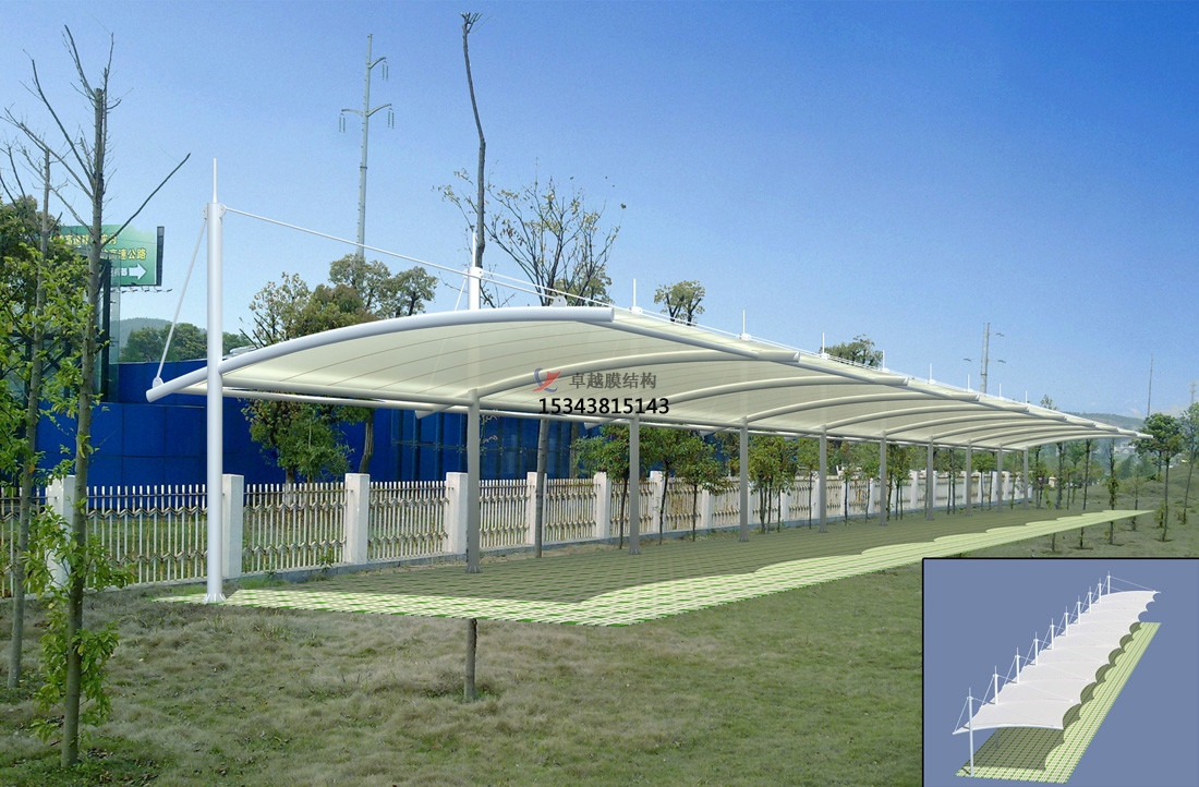 膜結(jié)構(gòu)停車場(chǎng)性能優(yōu)勢(shì):膜結(jié)構(gòu)停車場(chǎng)具有透光性好、隔熱性佳、自潔性強(qiáng)、抗震性強(qiáng)、防水性優(yōu)等特點(diǎn)。其中透光性好,是因?yàn)槟げ木哂幸欢ǖ耐腹饴?,能使自然光線透過(guò),形成柔和的漫射光,不僅可以節(jié)約白天的照明能源,還能提高停車場(chǎng)內(nèi)的視覺舒適度,減少照明設(shè)備的使用,降低能耗。隔熱性佳,優(yōu)質(zhì)的膜材具有良好的隔熱性能,能有效阻擋太陽(yáng)輻射熱,降低停車場(chǎng)內(nèi)的溫度,減少車輛因高溫而產(chǎn)生的損耗,同時(shí)也為停車者提供更舒適的環(huán)境。自潔性強(qiáng),膜材表面通常加涂有防護(hù)涂層,如聚氟乙烯、丙烯酸等,這些涂層具有不發(fā)粘、耐高溫的特點(diǎn),落到膜材表面的灰塵可以靠雨水的自然沖洗而達(dá)到自潔的效果,使停車場(chǎng)保持整潔美觀??拐鹦詮?qiáng),膜結(jié)構(gòu)具有良好的彈性和柔韌性,在地震等自然災(zāi)害發(fā)生時(shí),能夠通過(guò)自身的變形來(lái)吸收和耗散能量,有效抵抗地震力,保障停車場(chǎng)的結(jié)構(gòu)安全和車輛的停放安全。防水性優(yōu),膜材本身具有優(yōu)異的防水性能,拼接處經(jīng)過(guò)專業(yè)處理,能有效防止雨水滲透,為車輛提供可靠的遮雨保護(hù),避免車輛遭受雨水侵蝕。