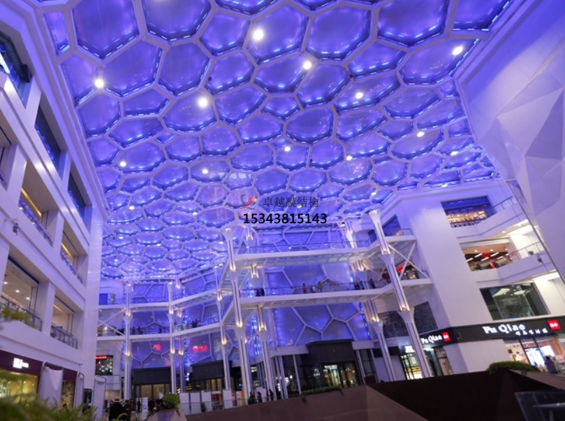 簡介:大家如果去大型的商場可能會注意到,其廊道或者大廳頂部都是采用了半透明或者透明的建筑材料,這種設(shè)計不僅滿足了商場對于自然采光的要求,使得整個商場看上去更加的敞亮,而且在白天還能大大的節(jié)省照明設(shè)施的運(yùn)行時間,降低了能耗,以前在膜結(jié)構(gòu)沒有大規(guī)模應(yīng)用的時候,實(shí)現(xiàn)這種效果,都是采用了陽光板或者鋼化玻璃等材料,這些材料都有明顯的缺點(diǎn),比如說陽光板受陽光直射的作用老化速度會大大加快,鋼化玻璃自重較重對于支承結(jié)構(gòu)要求高,而且安全性是個難點(diǎn),但是膜結(jié)構(gòu)的出現(xiàn)解決了傳統(tǒng)材料的種種弊端,PTFE及ETFE膜材不僅可以實(shí)現(xiàn)透光性,而且自重輕,安全性更高,特別是ETFE其高自潔、高透光特性已經(jīng)成為了大型商業(yè)街區(qū)穹頂天幕的首選。