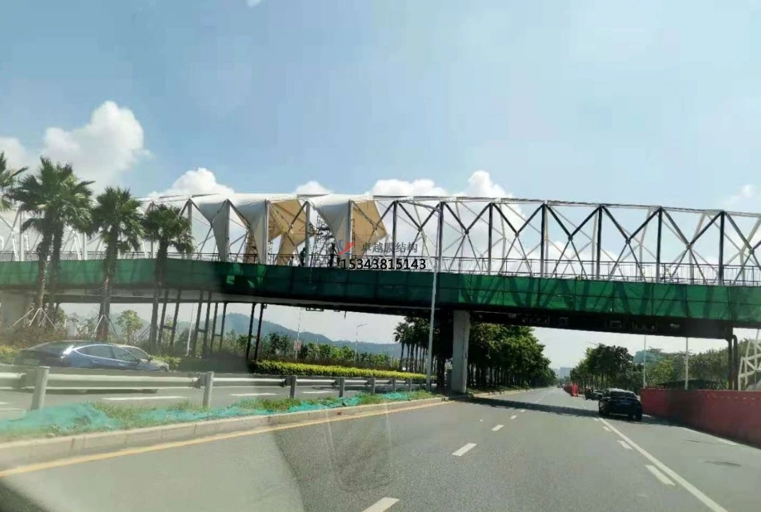為了保質(zhì)、保量、保證工期、保安全的情況下順利的把項(xiàng)目交到業(yè)主手中,把施工人員分成兩班晝夜不分,日夜加班,還要克服現(xiàn)場的高溫,施工節(jié)點(diǎn)的困難,而且每片膜材的尺寸也不相同,為了膜材裁剪精準(zhǔn),設(shè)計(jì)師每跨每跨的量尺寸,又復(fù)合尺寸,確保了天橋立面膜結(jié)構(gòu)的安裝工程順利進(jìn)行。