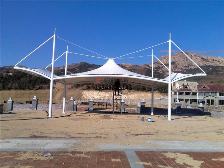 因?yàn)榫坝^膜結(jié)構(gòu)遮陽(yáng)棚是由多種高強(qiáng)薄膜資料及加強(qiáng)構(gòu)件經(jīng)過(guò)必定方法使其內(nèi)部發(fā)生必定的預(yù)張應(yīng)力以構(gòu)成某種空間形狀,作為掩蓋結(jié)構(gòu),并能接受必定的外荷載效果的一種空間結(jié)構(gòu)方式。