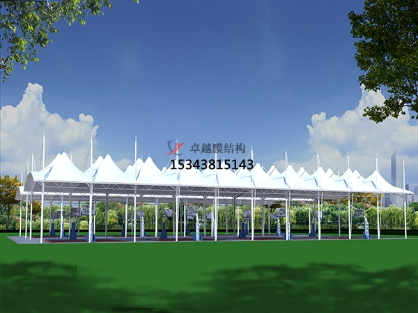 1、混凝土結(jié)構(gòu)主體加鋼拱以上兩種更簡單的膜結(jié)構(gòu),依平面的形狀,如方形、菱形等,可有許多變化,拱的間距依使用的膜材強度、設(shè)計荷載、風(fēng)力等確定。