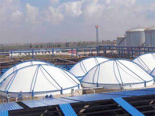2、由于所有鋼支撐反吊膜結(jié)構(gòu)均為密封體且膜結(jié)構(gòu)造型為光滑曲面(負(fù)高斯曲面),風(fēng)荷載體型系數(shù)小,抗風(fēng)等級(jí)高,可按照抵抗12級(jí)臺(tái)風(fēng)設(shè)計(jì);膜自身防腐性能好,自重輕,對(duì)大跨度池體最具優(yōu)勢(shì),造型多樣,美觀新穎;3、安裝快捷:鋼結(jié)構(gòu)制作和膜體的加工都在工廠進(jìn)行,加工質(zhì)量得到可靠保障?,F(xiàn)場(chǎng)安裝時(shí)間短,減少了對(duì)場(chǎng)地的占用。尤其是舊池體改造項(xiàng)目可采取結(jié)構(gòu)整體吊裝,不影響池體內(nèi)部的設(shè)備運(yùn)轉(zhuǎn);4、檢修方便:由于工藝上的要求,需要定期對(duì)設(shè)備維修和檢查,可以通過(guò)在邊膜上預(yù)留門(膜結(jié)構(gòu)密封垂簾門或塑鋼窗)和通道的方式解決。5、密封性能好:所有膜材采用熱熔焊接,現(xiàn)場(chǎng)安裝的膜材片之間采用現(xiàn)場(chǎng)熱熔焊接的“二次節(jié)點(diǎn)密封”既保證罩體的密封,又能保證隔絕內(nèi)部腐蝕氣體對(duì)鋼結(jié)構(gòu)的腐蝕。6、便于與現(xiàn)場(chǎng)設(shè)備管道密封連接:所有立面的膜結(jié)構(gòu)均可按需要現(xiàn)場(chǎng)開(kāi)洞,現(xiàn)場(chǎng)熱熔焊接恢復(fù)氣密性。三、美觀性