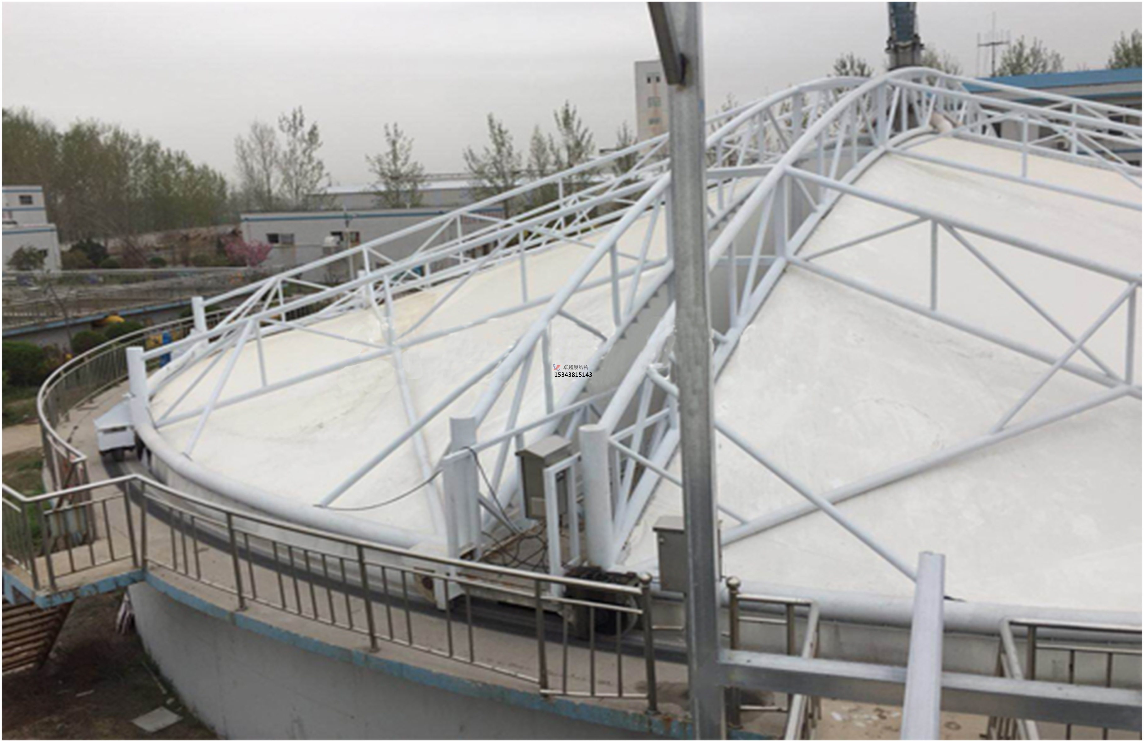 污水池封閉罩通常采用鋼支撐反吊UV膜結(jié)構(gòu)技術(shù),這種技術(shù)可以解決鋼結(jié)構(gòu)由于與腐蝕性氣體接觸而帶來(lái)的腐蝕問(wèn)題,同時(shí)實(shí)現(xiàn)了結(jié)構(gòu)骨架與覆蓋材料的完美結(jié)合。此外,還有一種內(nèi)外膜氣罩封閉技術(shù),即雙膜氣罩,這種技術(shù)類似于在污水池上蓋了一個(gè)氣囊,通過(guò)四邊與污水池池壁的錨固,形成一個(gè)穩(wěn)定的受力結(jié)構(gòu),從而將污水池池內(nèi)惡臭氣體封閉在一個(gè)相對(duì)較小的空間里。