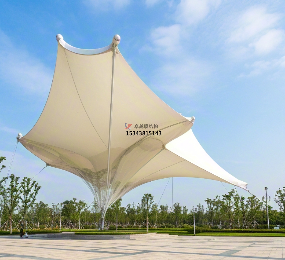 這些膜材共有的特性賦予了景觀膜結(jié)構(gòu)一種輕盈而靈動(dòng)的視覺(jué)效果。相較于傳統(tǒng)的建筑材料,膜材的重量微乎其微,卻擁有驚人的張力承受能力,宛如一張堅(jiān)韌的“皮膚”,能夠被拉伸成各種充滿創(chuàng)意的形狀。這種輕質(zhì)特性不僅有效降低了基礎(chǔ)設(shè)施建設(shè)成本和施工難度,還使得膜結(jié)構(gòu)能夠在特殊地形或荷載限制嚴(yán)格的區(qū)域得以應(yīng)用,從而極大地豐富了景觀設(shè)計(jì)的可能性。