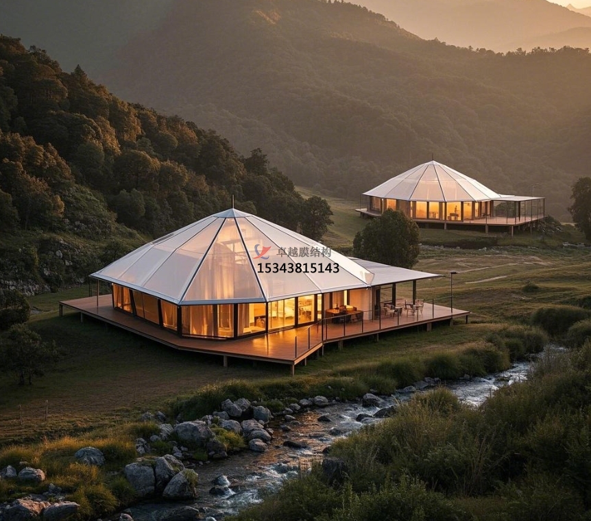 帳篷酒店膜結(jié)構(gòu)以其豐富多變的造型脫穎而出。設(shè)計靈感常來源于自然界,如白蟻巢穴、蜂巢、螢火蟲和蝸牛等生物形態(tài)。建筑師通過巧妙構(gòu)思,將這些元素融入設(shè)計,打造出方形帳篷、螺旋帳篷等獨特空間結(jié)構(gòu)。帳篷的輕盈、通透特質(zhì),與周圍自然環(huán)境完美呼應(yīng),形成一道獨特風(fēng)景線。像可見澤棲帳篷酒店,其客房 “水映螢火” 采用玻璃箱外蓋膜結(jié)構(gòu),既保證貼水居住的舒適感,又解決遮陽難題;“螺中洞天” 客房則運(yùn)用雙層膜與保溫棉結(jié)構(gòu),滿足螺旋造型需求的同時,提升內(nèi)部舒適度,從不同角度展現(xiàn)出膜結(jié)構(gòu)在美學(xué)設(shè)計上的無限可能。