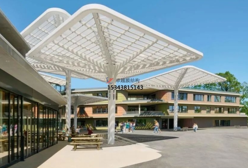 膜結(jié)構(gòu)景觀可以采用多種形狀和顏色的膜材料,通過張力和支撐系統(tǒng)來實現(xiàn)懸掛和張拉的效果,其設(shè)計靈感來自于自然界中的形態(tài)和結(jié)構(gòu),如植物葉片、動物骨骼等,常見的應(yīng)用包括遮陽棚、入口門廊、地標建筑等等。