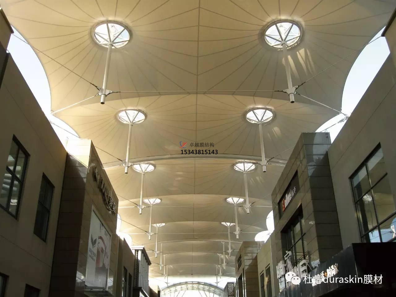 建筑入口使城市公共空間與建筑空間相鄰的界面,成為城市空間的組成部分。它是人們視覺最先接觸的部分,因此,除了功能以外,還應(yīng)有很強(qiáng)的標(biāo)識(shí)性,并能體現(xiàn)建筑的個(gè)性,是建筑環(huán)境和城市景觀的重要組成部分。由于膜結(jié)構(gòu)自然的曲線美是其他結(jié)構(gòu)類型無法比擬的,故成為近來建筑入口及屋頂經(jīng)常采用的形式。