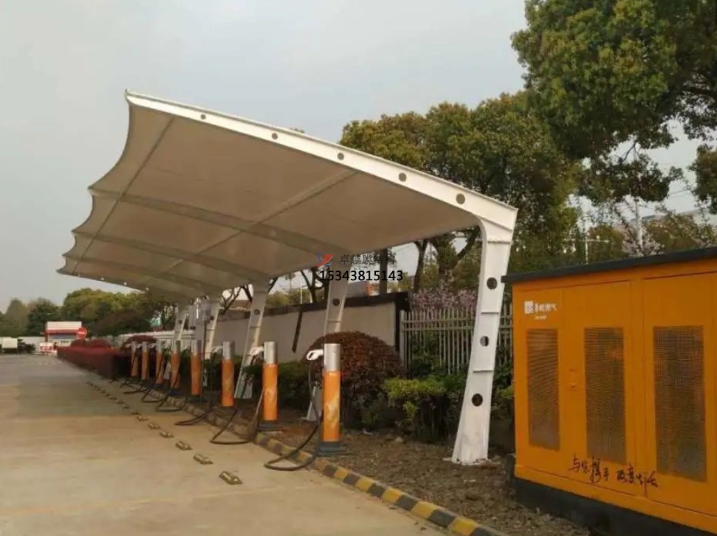 加氣站膜結(jié)構(gòu)雨棚是一種現(xiàn)代化的建筑形式,它采用高強(qiáng)度、高耐久性的膜材料,通過一定的技術(shù)手段和結(jié)構(gòu)設(shè)計(jì),形成一種具有獨(dú)特美學(xué)效果和實(shí)用功能的建筑形式。這種結(jié)構(gòu)形式在加氣站的應(yīng)用中,不僅可以提供寬敞、明亮的加油環(huán)境,還能有效地抵御各種惡劣天氣,提高顧客的舒適度和安全性。