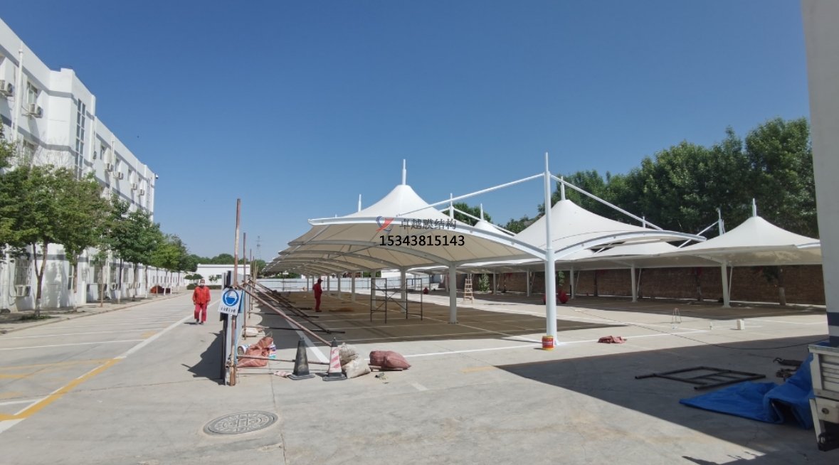 4、結(jié)構(gòu)輕巧:膜結(jié)構(gòu)材料本身重量輕,加上雙坡結(jié)構(gòu)的合理設(shè)計,使得整個車棚的重量相對較輕,對基礎(chǔ)的要求較低,降低了施工難度和建設(shè)成本。同時,輕巧的結(jié)構(gòu)也便于運輸和安裝,縮短了施工周期。