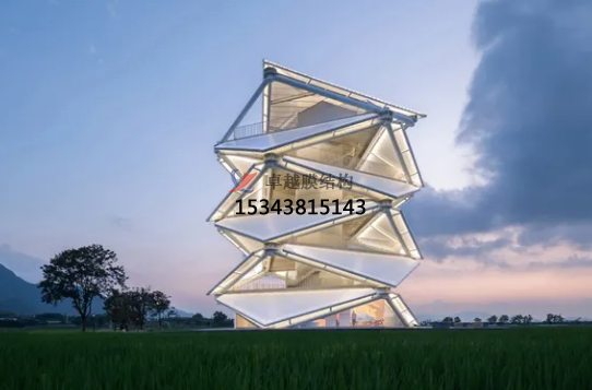 建筑的表面為白色的高強(qiáng)度薄膜結(jié)構(gòu),每層交錯布置,在登塔的漫游路徑中通過框景的變化展現(xiàn)出移步異景的視覺感受。項(xiàng)目面向所有人開放,乘坐輪椅的訪客也可以通過底層中心的核心筒電梯直達(dá)頂層。從頂層的觀景臺,人們可以獲得360度的視野,視線可以延伸到遠(yuǎn)處的村莊和城市。