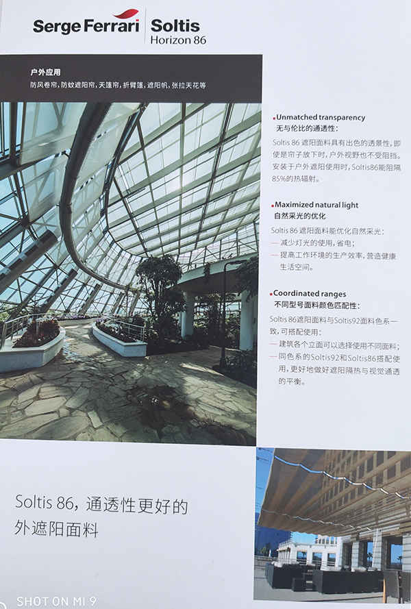 紗帝飾:紗帝飾面料為抵擋熱量和光線的真正盾牌,依靠其微型通風結構,調節(jié)陽光的熱效應,有效地防眩目。紗帝飾面料具有46種顏色,可為所有建筑,無論是 公眾場合還是私人住宅提供配套的眾多色彩和多種用途。法拉利預應力專利制造技術給紗帝飾織物帶來尺寸恒定,不會變形,無需加固自然抗撕拉,耐久和抗塵,占 地面積小等獨有特性,更顯出紗帝飾面料對建筑物技術性遮陽無可匹敵的優(yōu)勢。