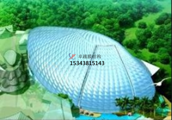 ETFE膜材:ETFE的化學(xué)名稱為乙烯-四氟乙烯共聚物,它是一種高分子材料,具有良好的耐化學(xué)性能。ETFE薄膜可通過高溫熔化ETFE顆粒后經(jīng)擠壓成型得到,用于建筑屋面或墻面材料時(shí),厚度通常為50~300um.純凈的ETFE無(wú)色,可加工到透明的ETFE薄膜,透光性高達(dá)95%.也可以在ETFE中混入添加劑進(jìn)行染色,得到各種顏色的ETFE薄膜。