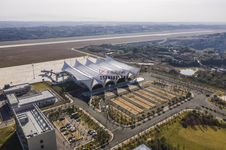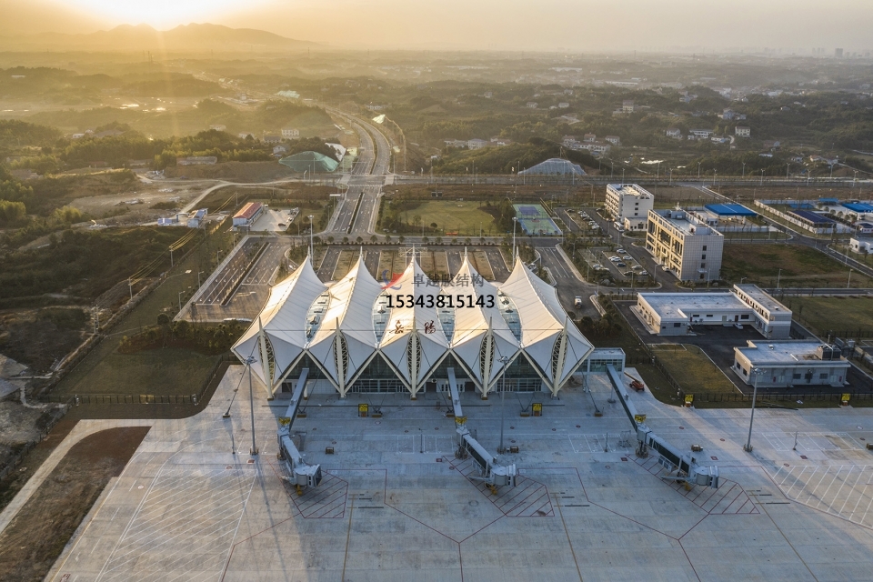航站樓創(chuàng)新性地采用PTFE拉膜結(jié)構(gòu)體系創(chuàng)造出具有獨一無二的現(xiàn)代航空港造型,鋼結(jié)構(gòu)梭柱與白色拉膜的組合將岳陽的傳統(tǒng)景點——瀟湘八景之一:“遠(yuǎn)浦歸帆”的意境以現(xiàn)代的方式重新演繹,體現(xiàn)濃郁的現(xiàn)代氣息的同時又延續(xù)了傳統(tǒng)地域文化。