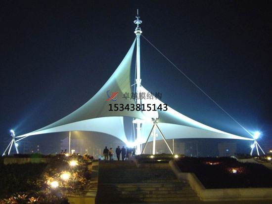 一個城市的中心區(qū)反映一個城市的地理風貌和民族風情,同時,也是一個城市文化發(fā)展程度的標志。而景觀設計要求其具有廣泛的可讀性、雅俗共賞,既有超凡脫俗的藝術價值,又能使大眾喜聞樂見與大眾息息相通。張拉膜以其鮮明的個性和標識性,應用于城市小品設計中。