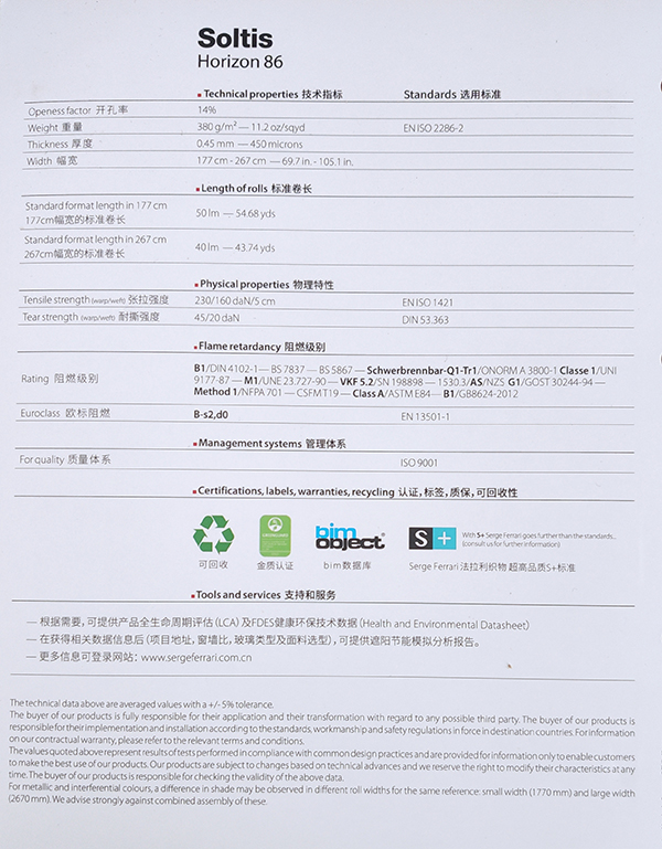 紗帝飾:紗帝飾面料為抵擋熱量和光線的真正盾牌,依靠其微型通風(fēng)結(jié)構(gòu),調(diào)節(jié)陽(yáng)光的熱效應(yīng),有效地防眩目。紗帝飾面料具有46種顏色,可為所有建筑,無(wú)論是 公眾場(chǎng)合還是私人住宅提供配套的眾多色彩和多種用途。法拉利預(yù)應(yīng)力專(zhuān)利制造技術(shù)給紗帝飾織物帶來(lái)尺寸恒定,不會(huì)變形,無(wú)需加固自然抗撕拉,耐久和抗塵,占 地面積小等獨(dú)有特性,更顯出紗帝飾面料對(duì)建筑物技術(shù)性遮陽(yáng)無(wú)可匹敵的優(yōu)勢(shì)。