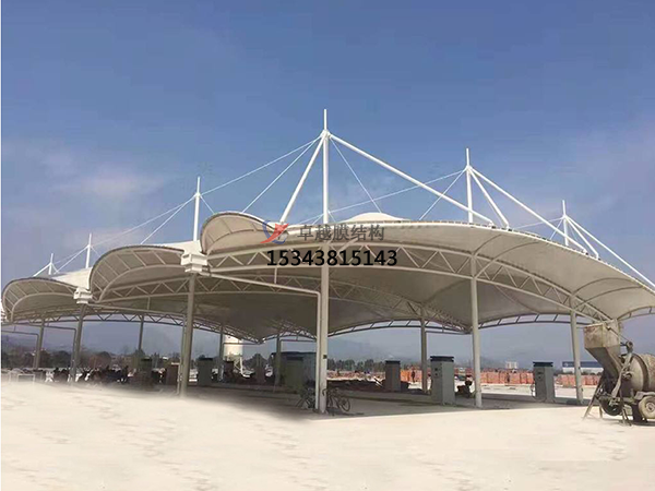 膜結(jié)構(gòu)加油站頂棚比傳統(tǒng)加油站罩棚的優(yōu)勢:一、造型獨特,辨識度高,由于膜材重量輕,非常適合加油站這種大跨度的建筑,采用張力結(jié)構(gòu)所以在造型設(shè)計上具有很大的優(yōu)勢,能夠?qū)崿F(xiàn)非常具有藝術(shù)氣息的造型。二、膜布材質(zhì)具有很好的自潔性,對附著的灰塵雜物一場雨就能洗刷干凈,不需要花費人力物力去維護。