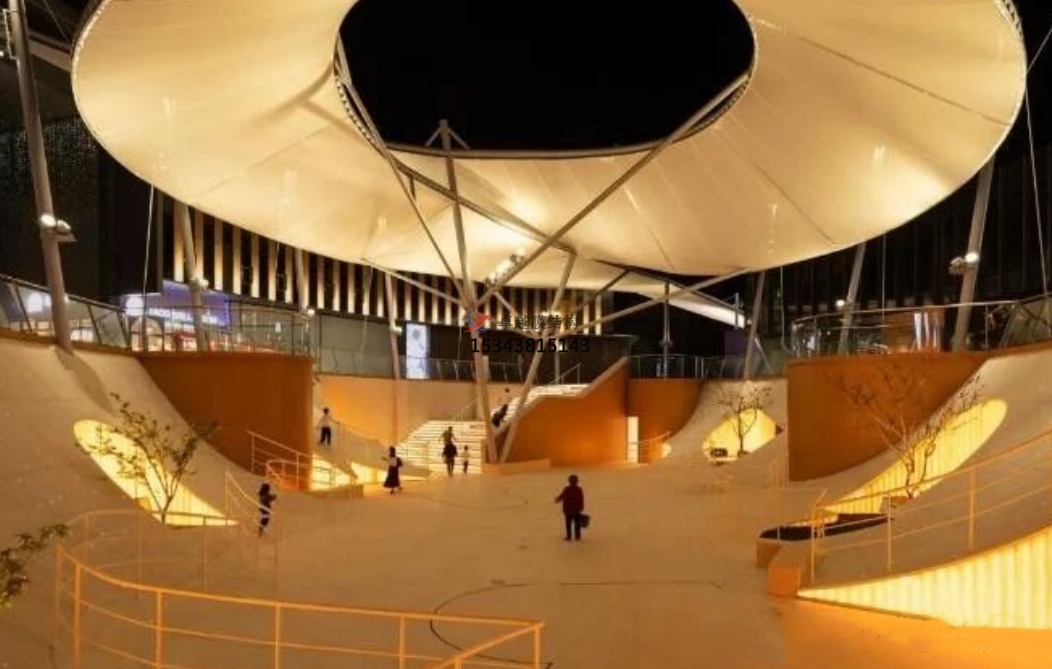 但不管怎么有格調(diào)的下沉式商業(yè)。廣場,它也是一個半露天的公共空間,如果缺乏遮陽避雨設施,無法提供更加舒適的休閑環(huán)境,因此,在下沉廣場上方增設頂蓋是非常必要的,而且一個兼具美觀、時尚、實用的頂蓋也是建筑的加分項。