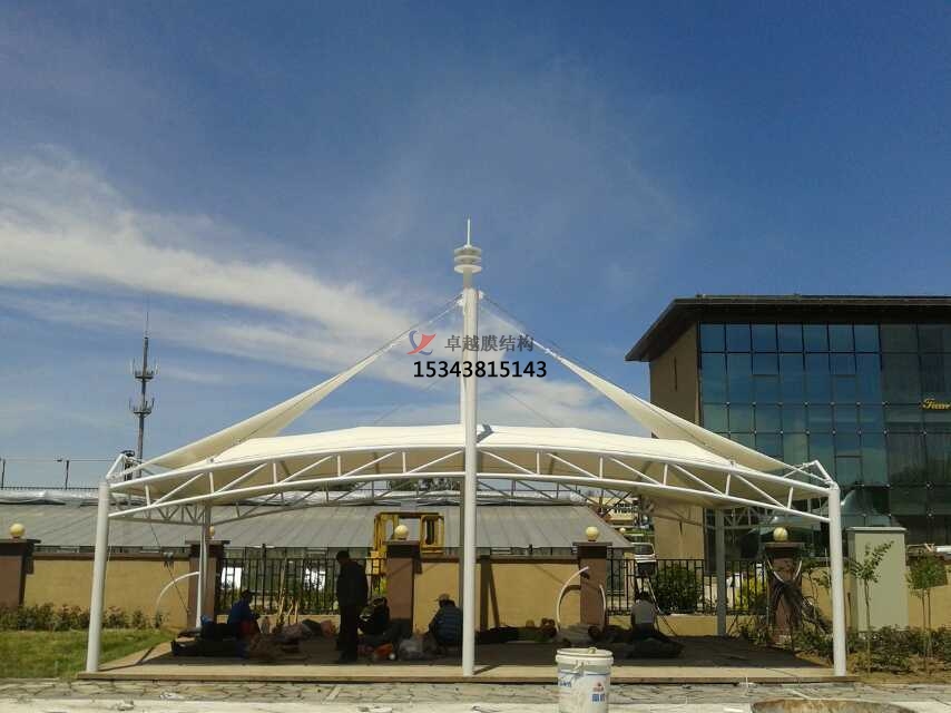 6、景觀設(shè)施:膜結(jié)構(gòu)以其特殊的建筑表現(xiàn)手法,主要體現(xiàn)在造型、漫射透光性、豐富多彩,可廣泛應(yīng)用于入口、標(biāo)志性小品 、步行街、停車場(chǎng)等,其他建筑特性無(wú)須較高要求。