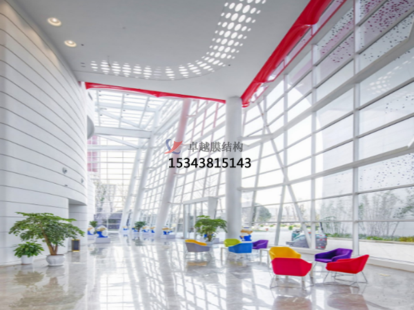膜材透光性是由它的基層纖維、涂層及其顏色所決定的。標(biāo)準(zhǔn)膜材的光譜透射比在10%~20%之間,有的膜材的光譜透射比可以達(dá)到40%,而有的膜材則是不透光的。膜材的透光性及對光色的選擇可以通過涂層的顏色或是面層顏色來調(diào)節(jié)。