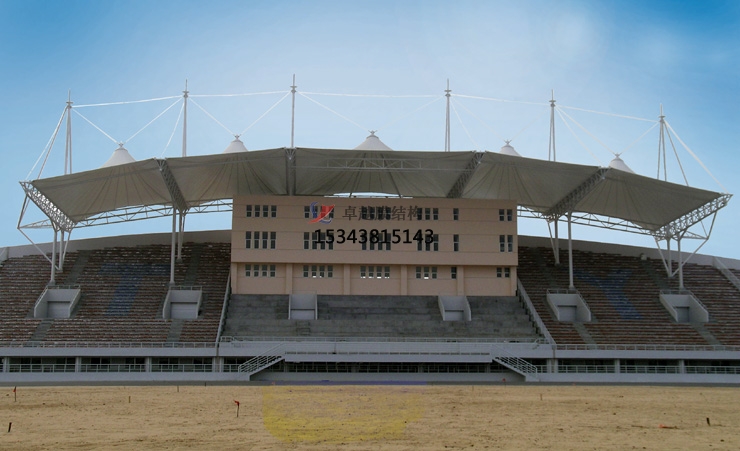 訂制體育場膜結構看臺材料選擇:其主要是膜材選擇和輔助材料兩種。其中主流膜材類型分為PTFE(聚四氟乙烯)、PVC(聚氯乙烯)和ETFE(乙烯-四氟乙烯共聚物)三種。特點PTFE(聚四氟乙烯)具有耐高溫、耐腐蝕,適合惡劣環(huán)境的特點;PVC(聚氯乙烯),經(jīng)濟實用,透光性和抗紫外線性能均衡;ETFE(乙烯-四氟乙烯共聚物),輕質高透光,適合大跨度結構。輔助材料也就是支撐結構,支撐結構多采用碳鋼、鋁合金或仿生樹形鋼結構,需通過抗風壓、雪荷載測試。